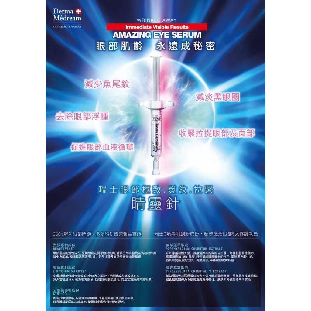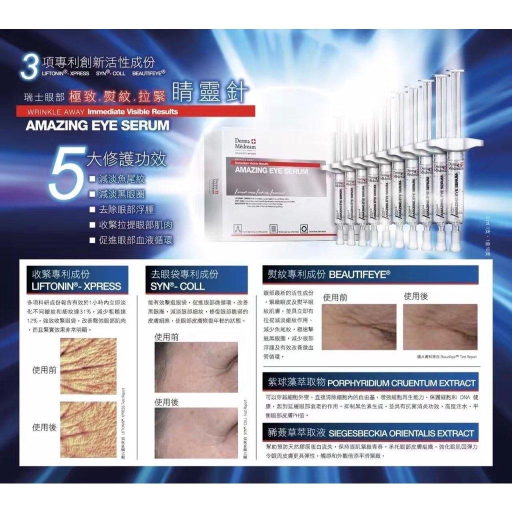 瑞士眼部極致‧熨紋‧拉緊‧睛靈針 (非注射式‧只限外塗) (黑眼圈、眼部浮腫、緊緻、魚尾紋、拉提) 每支e2ml,10支一盒 眼部肌齡,永遠成秘密 熨紋‧拉緊‧去眼袋 360∘解決眼部問題,多項科研臨床報告實證 瑞士3項專利創新成份‧超導激活眼部5大修護功效 淡魚尾紋‧減淡黑眼圈‧去除眼部浮腫‧收緊拉提眼部肌肉‧促進眼部血液循環